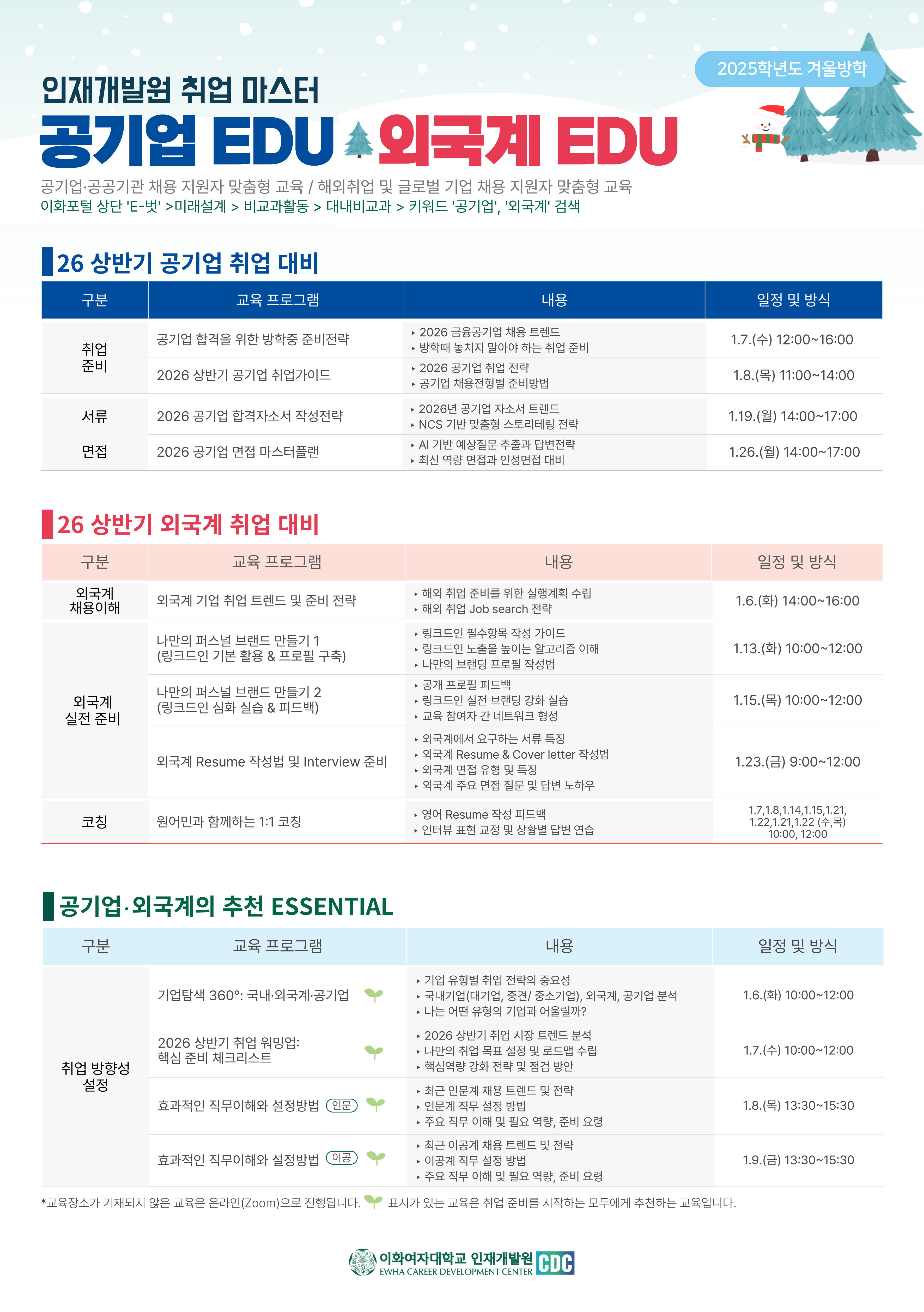 인재개발원에서 개설하는 2025학년도 겨울방학 진로·취업 교육프로그램을 다음과 같이 안내드립니다.