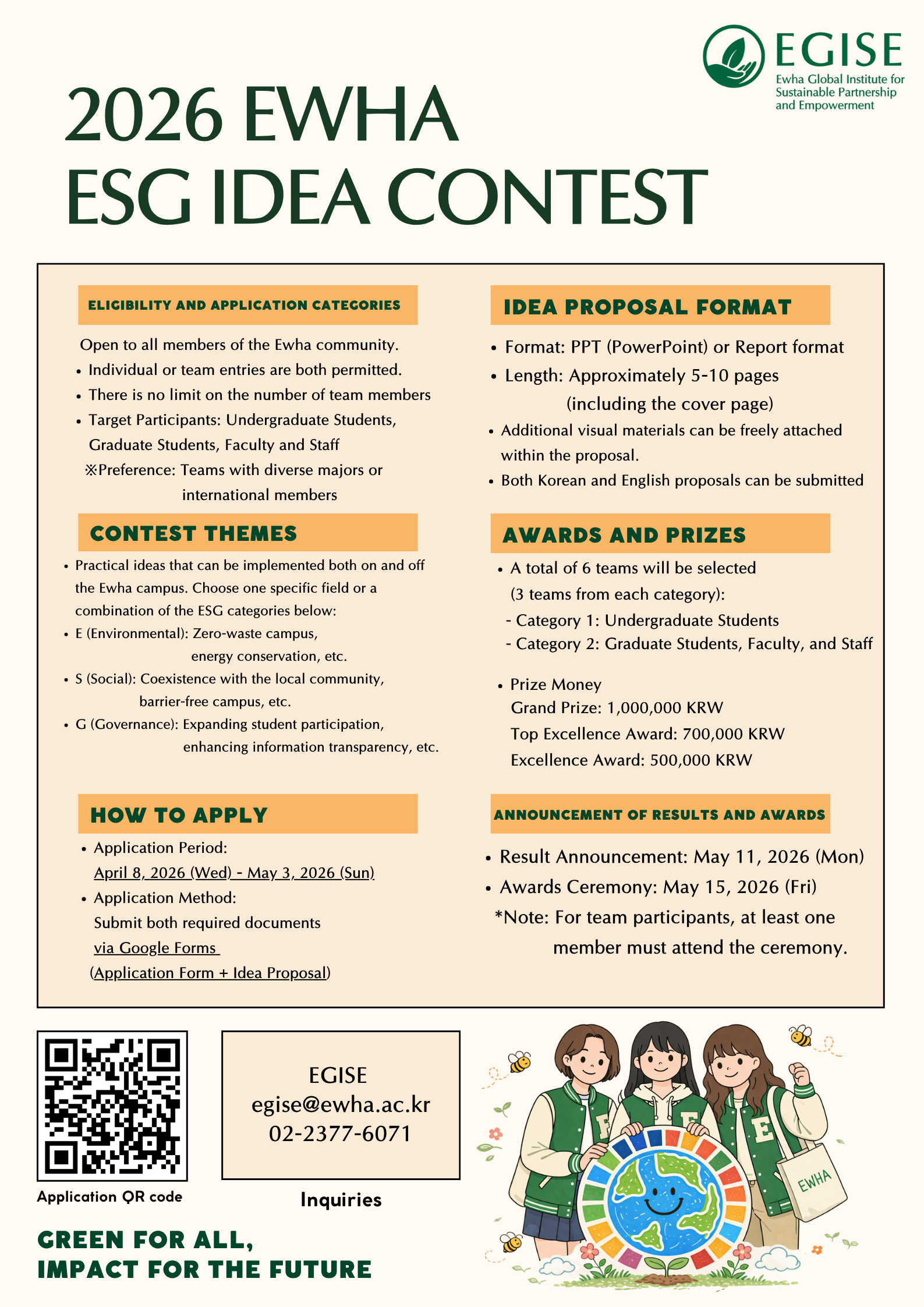 이화글로벌사회공헌원(EGISE)에서 진행하는 공모전에 대해 안내드리니, 많은 참여바랍니다.