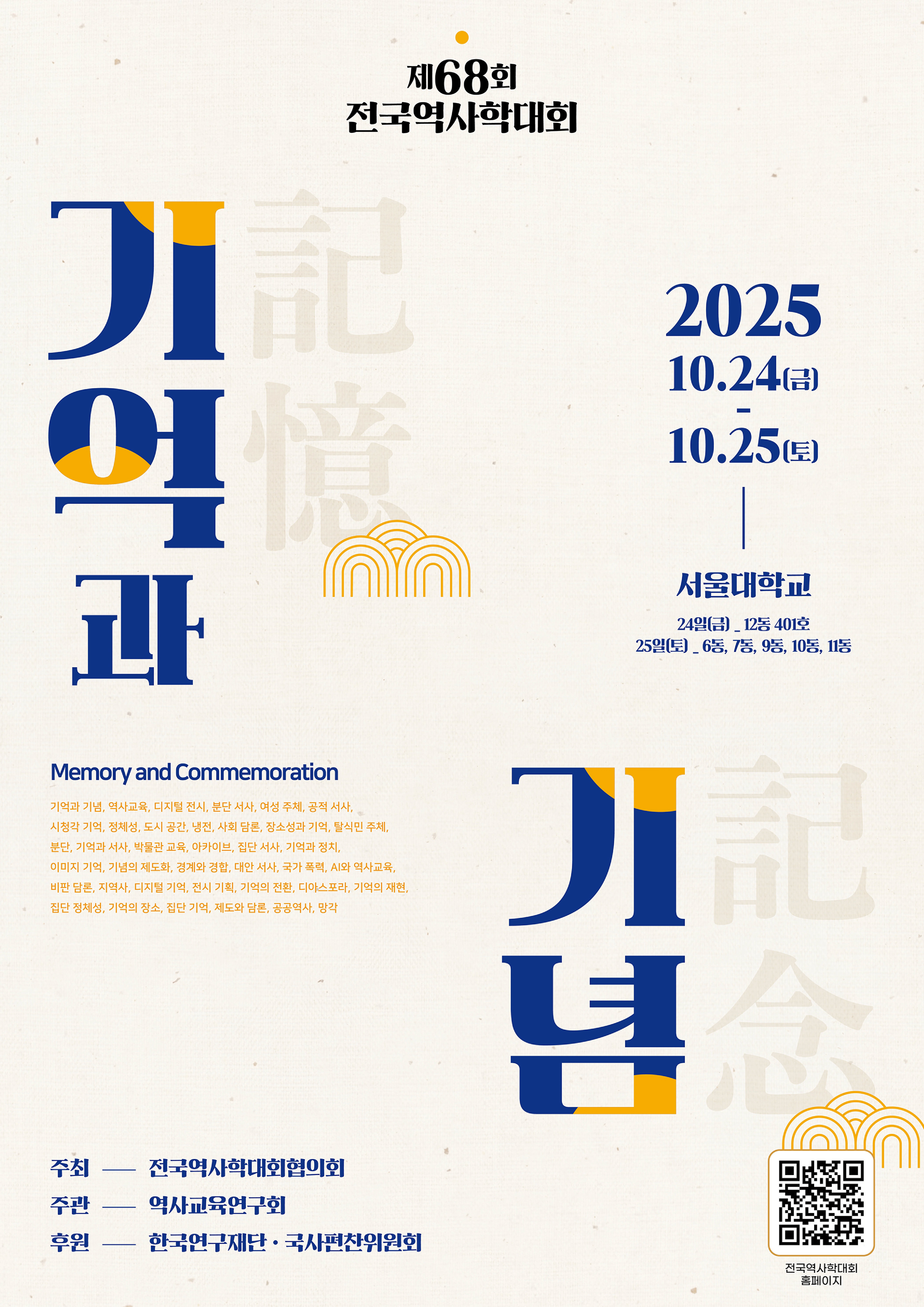 제68회 전국역사학대회는 2025년 10월 24일(금)과 25일(토) 이틀간 서울대학교에서 종전과 동일한 방식으로 개최됩니다. 첫째 날에 공동 주제 발표가 진행되고 학부생 대상의 역사 콘텐츠 경연대회 수상이 있습니다. 둘째 날은 학회별 분과 발표로, ‘기억과 기념’이라는 주제 하에 각 학회의 관심과 특성을 반영한 다채로운 논의가 27개 분과 발표를 채울 것입니다. 아울러 2024년부터 대학원생 포스터 발표를 지원하여 학문 후속 세대의 발굴과 세대간 교류를 촉진하고 있습니다.