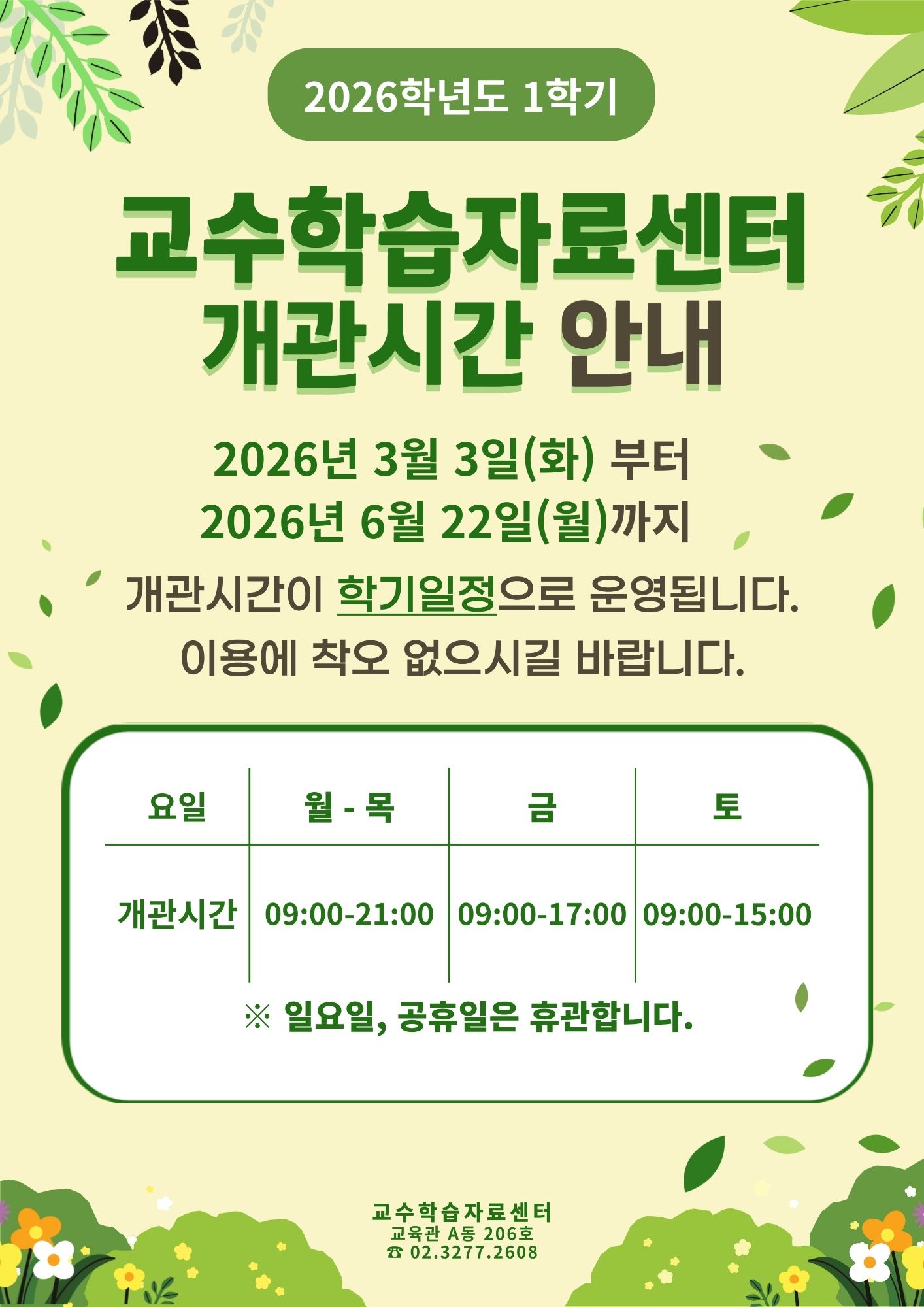 [공지] [교수학습자료센터] 2026학년도 1학기 개관시간 안내 (3/3(화)~6/22(월))